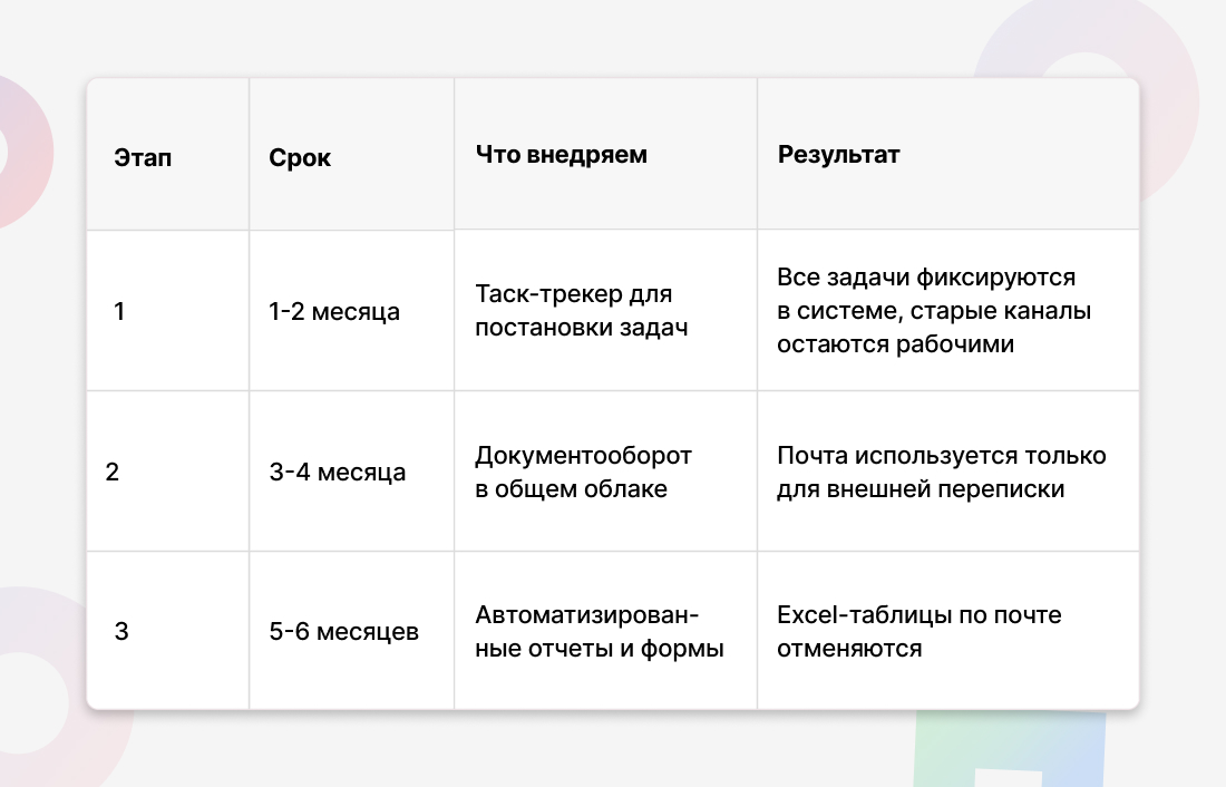 Каналы коммуникации внутри компании меняются поэтапно, чтобы не парализовать работу. Постепенный переход дает сотрудникам время адаптироваться и снижает сопротивление изменениям.